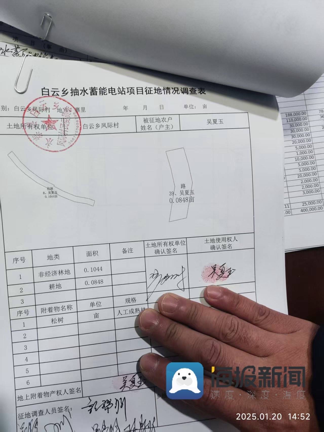 吴承钰称,有一块地距离他家房屋很近,所属权是由我方、堂叔及堂哥三家东谈主占主体的,然而邻居告成在《白云乡抽水蓄能电站表情征地情况探问表》上签了字。2025年1月20日,他趁尚未动工建议这块地存在争议,但其后工程依然在该地块进行了。