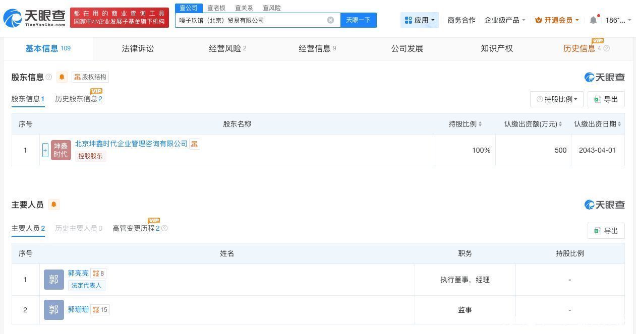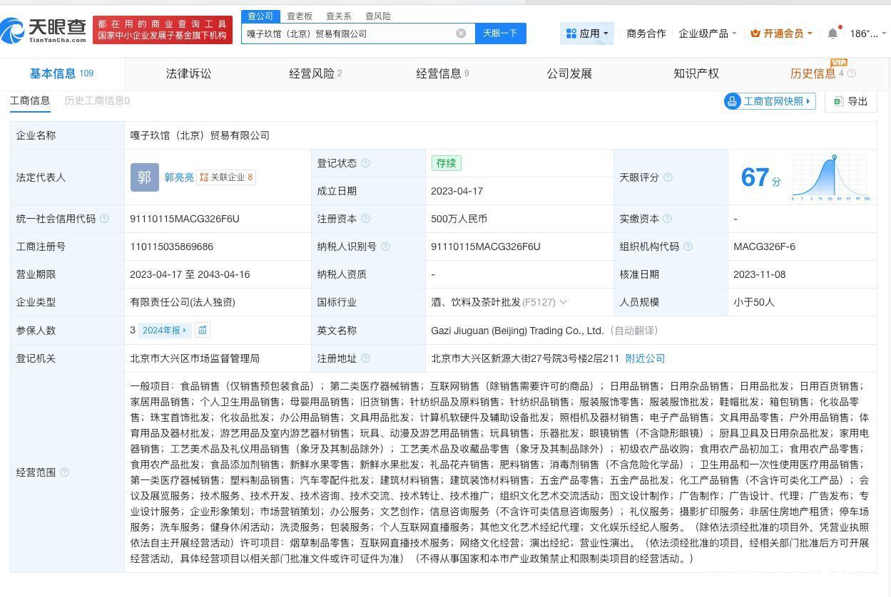嘎子玖馆(北京)生意有限公司成立于2023年4月,法定代表东谈主为郭亮亮,郭珊珊(嘎子哥太太)担任监事,注册老本500万东谈主民币,计议界限包括食物销售、第二类医疗器械销售、互联网销售等。鼓吹信息线路,该公司由北京坤鑫时间企业处治有计划有限公司全资握股。