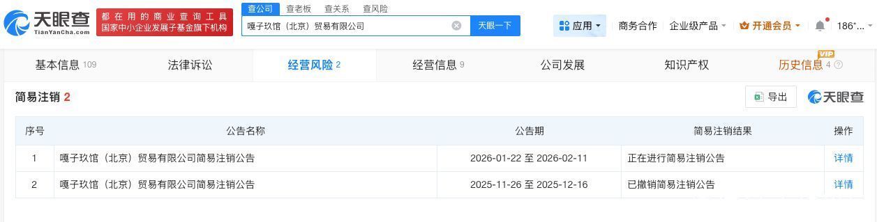 天眼查计议风险信息线路开云kaiyun官方网站,近日,嘎子玖馆(北京)生意有限公司新增一则肤浅刊出公告,公告期为2026年1月22日至2026年2月11日。