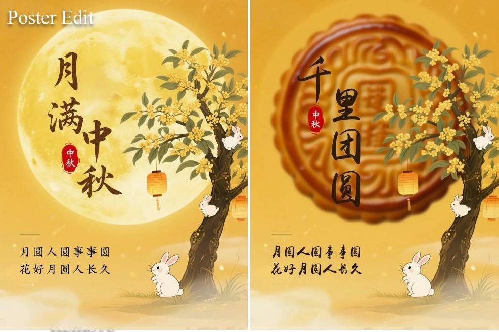 关于AI模子而言,归并汉文尤其是复杂书道艺术,曾是公认的技艺难题。UniWorld-V2凭借深耕汉文场景的技艺积贮,在这一范围收场了从“能处理”到“耀眼”的跳动。在“海报裁剪”示例中,模子能精确归并请示,并渲染出“月满中秋”和“月圆东说念主圆事事圆”等笔画复杂的艺术中翰墨体,效果了了、语义准确。