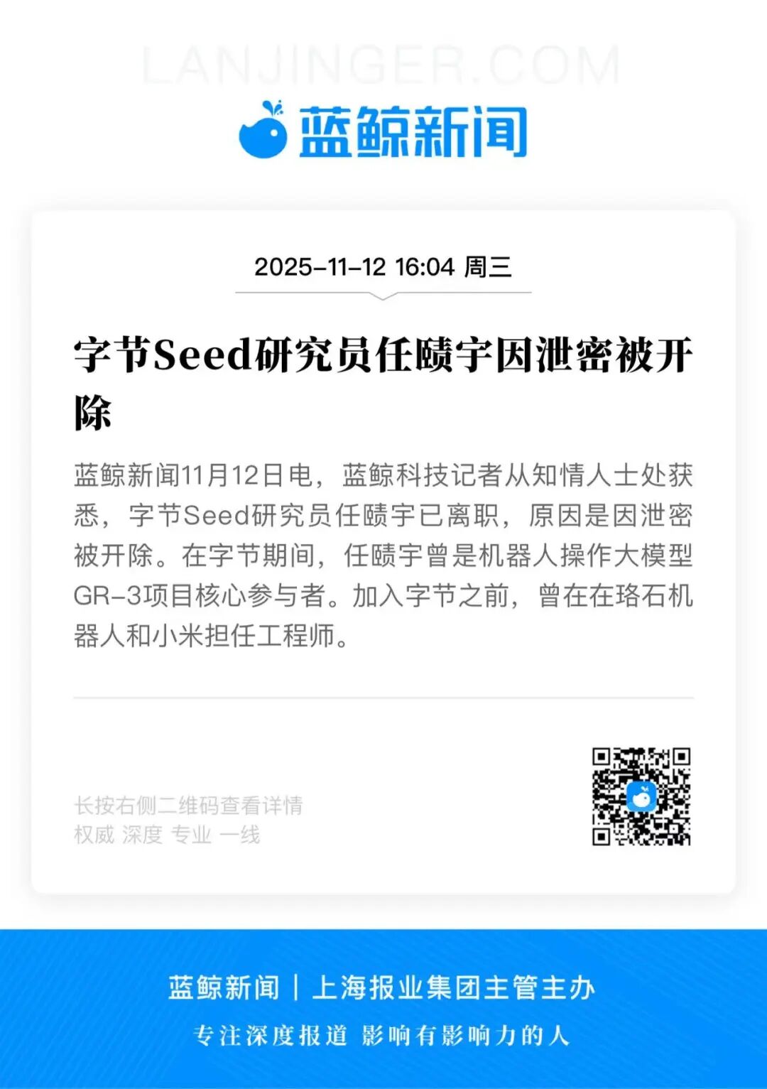 蓝鲸新闻11月12日电,蓝鲸科技记者从知情东说念主士处获悉,字节Seed推敲员任赜宇已下野,系因泄密被开除。在字节技巧,任赜宇曾是机器东说念主操作大模子 GR-3模式中枢参与者。加入字节之前,他曾在在珞石机器东说念主和小米担任工程师。
